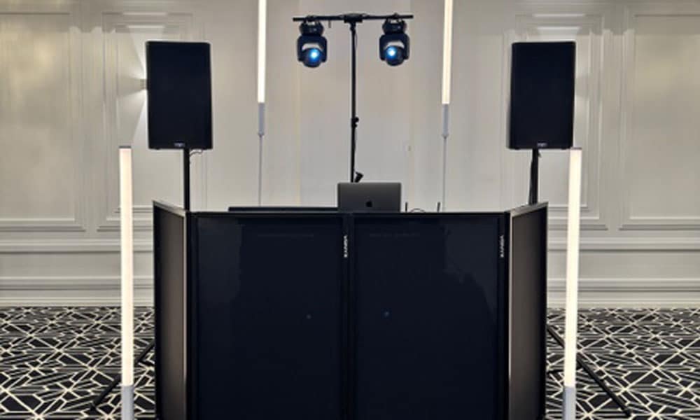 Our Wedding DJ package includes Consultation with your DJ, Personalised music curation, Wedding day run sheet planning, Award winning DJ for reception (5 hours), State of the art Pioneer DJ Equipment, QSC club quality high end speakers, Wireless microphone, World class Wedding lighting, Trestle table, Black fitted linen tablecloth, Setup and Pack down. See our package inclusions here